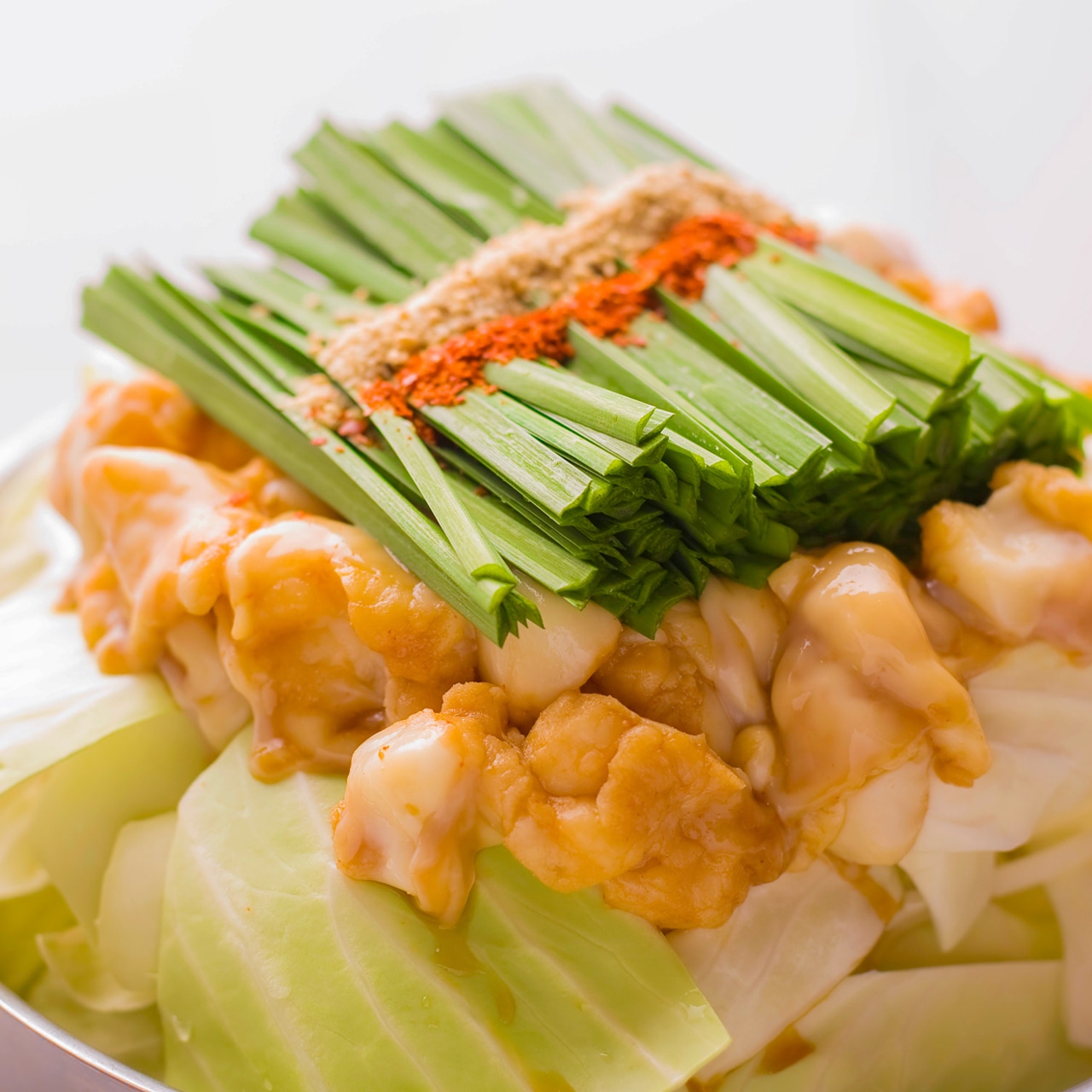 濃いめの醤油ベースのスープで煮込む、もつ衛門オリジナルのもつ鍋。